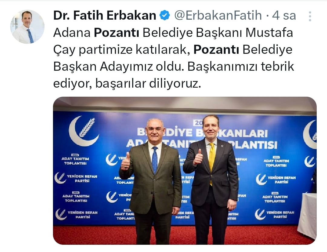 Yeniden Refah Partisi Genel Başkanı Dr. Fatih Erbakan, Başkan Mustafa Çay’ın partisinden Belediye Başkanı aday olduğunu kendi sosyal medya hessabından duyurarak şu cümleleri paylaştı;