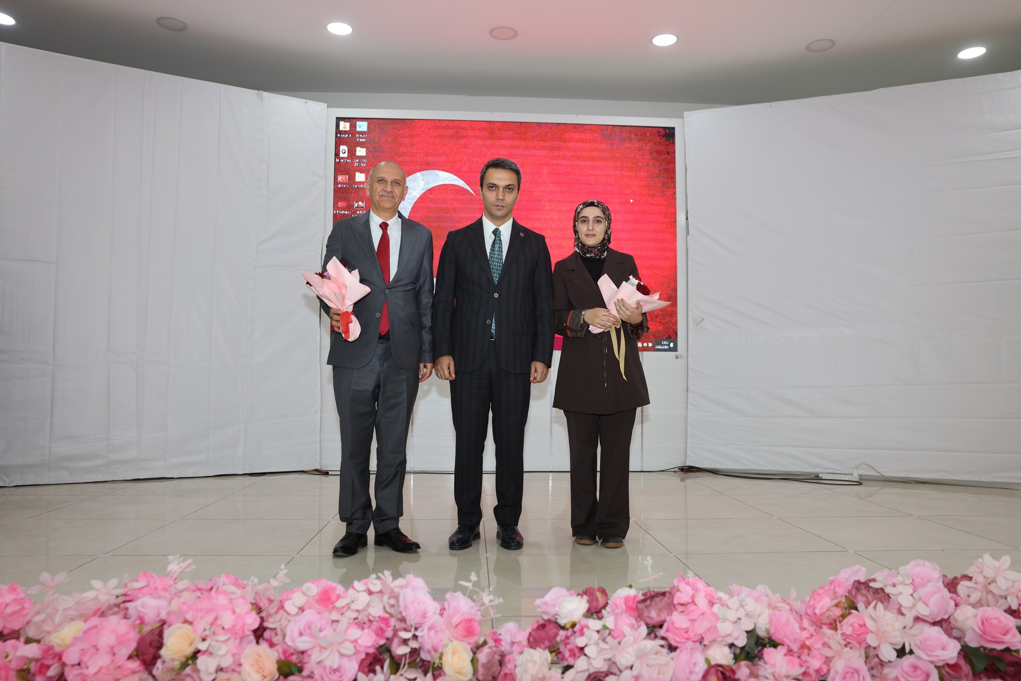 İlçe Kaymakamı Muhammet Cengiz tarafından öğretmenlik mesleğinde en kıdemli öğretmen olan İzzet Yıldızhan ve en genç öğretmen Emine Büşra Karataş’a çiçek takdim edip başarılar diledi.