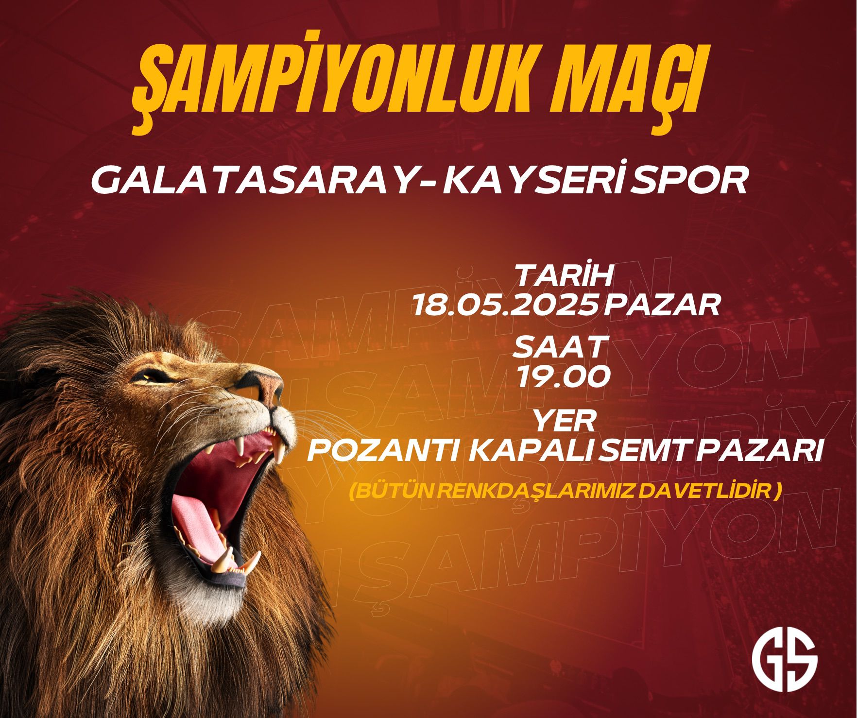 Pozantılı Galatasaraylı taraftarlar, 18 Mayıs 2025 Pazar günü oynanacak olan Galatasaray – Kayserispor şampiyonluk maçını hep birlikte coşku içerisinde izlemeye davet etti.