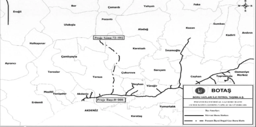 Amaç: Proje kapsamında inşa edilecek sabit tesisler, ulaşım yolları, enerji nakil hatları, katodik koruma hatları ve anot yataklarının yapımı için gerekli taşınmazların mülkiyetinin veya daimi/geçici irtifak hakkının tesisi yoluyla acele kamulaştırılması. Boru Hattı Güzergâhı Karar ekinde yer alan harita, boru hattının geçeceği güzergâhı gösteriyor. Haritaya göre proje, Adana ve Mersin illeri ağırlıklı olmak üzere, aşağıdaki ilçelerden geçiyor: