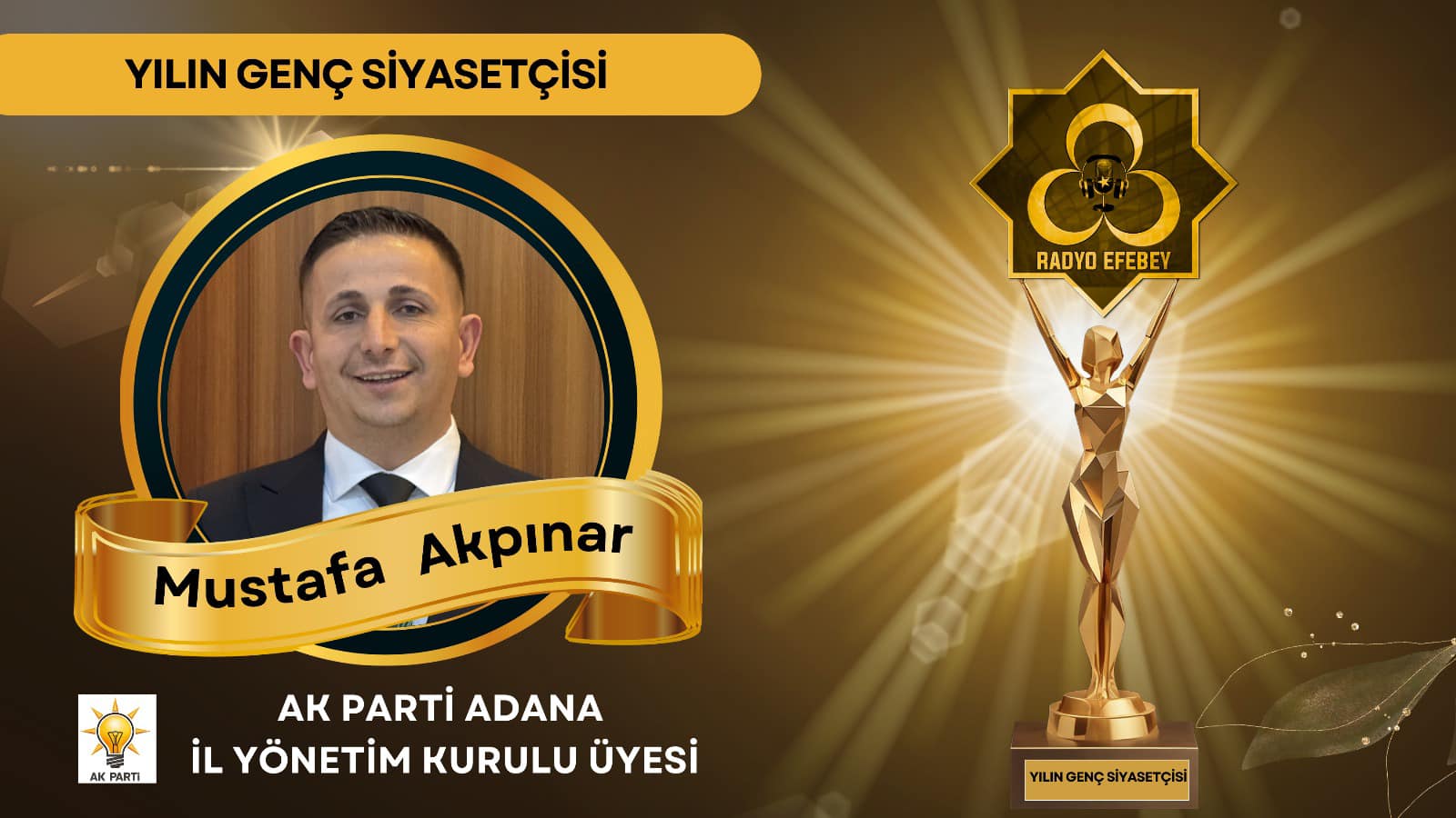 Geceye katılarak ödülünü alan Akpınar, “Bizlere bu ödülü layık gören Radyo Efebey yönetim kurulu başkanı Ayfun Kaplan ve ekibine teşekkür ediyorum. Bu ödülü “Siyasette gençlere yer vermek ustalığın şiarındandır” diyerek gençlere değer veren Dünya Liderimiz Sayın Cumhurbaşkanımız Recep Tayyip Erdoğan ve AK Parti Adana İl Başkanımız Sayın Tamer Dağlı’ya armağan ediyorum. Ayrıca Cumhur İttifakımızın paydaşı Milliyetçi Hareket Partisi’nin Genel Başkanı hemşehrimiz ve kıymetli büyüğümüz Devlet Bahçeli beyefendiye ise acil şifalar diliyorum.” dedi.